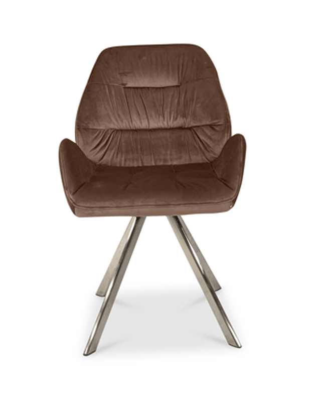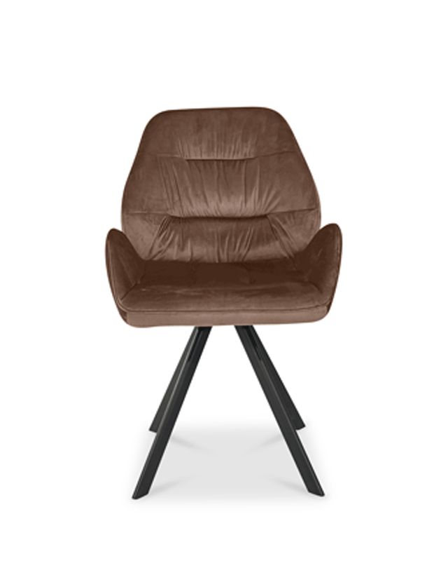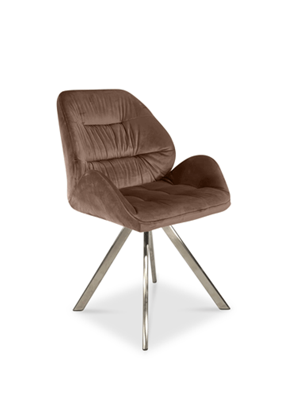 Abgesteppter Stuhl mit niedrigen Armlehnen. Drehgestell mit Rückholmechanismus. Stuhlschale positioniert sich nach dem Aufstehen immer wieder automatisch in die Mittelposition.