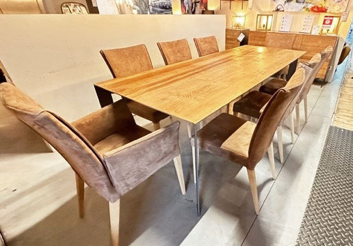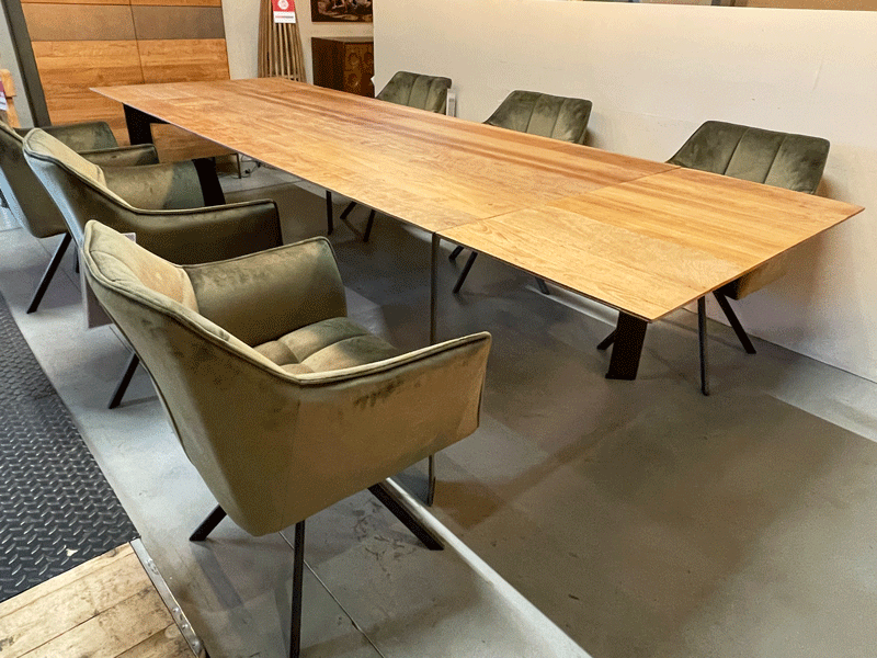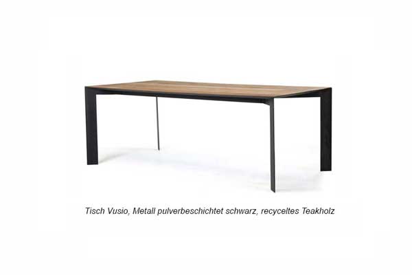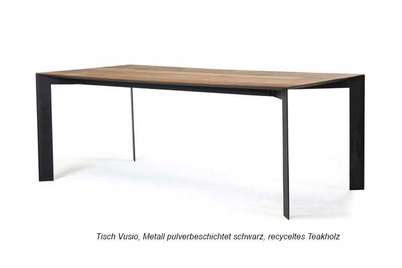 Esstisch aus unserer Vusio Serie im klaren Design. In den Längen 200 cm, 220 cm, 250 cm bestellbar. Tischplatte aus massivem, recyceltem Teakholz. Gestell - Metall pulverbeschichtet schwarz.  Auch mit Ansteckplatten erhältlich.