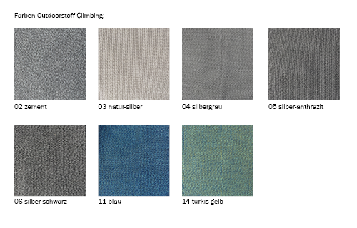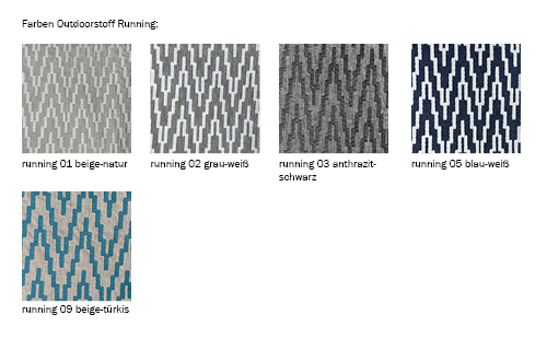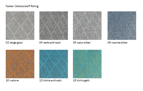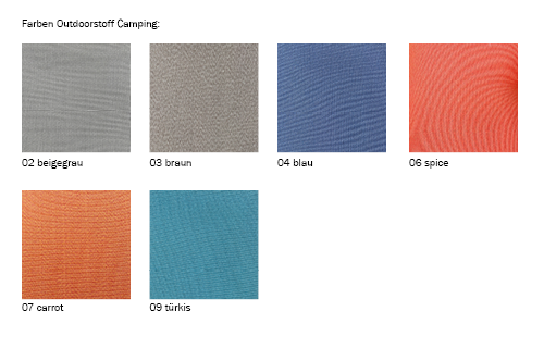 Auswahl hochwertiger Outdoorstoffe in wasserabweisender Webart. Die Bezüge sind extrem witterungsbeständig und verfügen über einen hohe Lichtechtheit. Ökotex - Standard 100 (keine PVC Anteile – Umweltschonender und nachhaltiger Produktionsstandard).